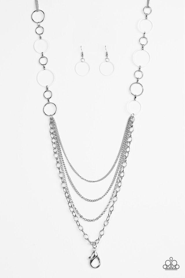 Neutral white and shiny silver hoops give way to layers of mismatched silver chain for an edgy look. A lobster clasp hangs from the bottom of the design to allow a name badge or other item to be attached. Features an adjustable clasp closure.