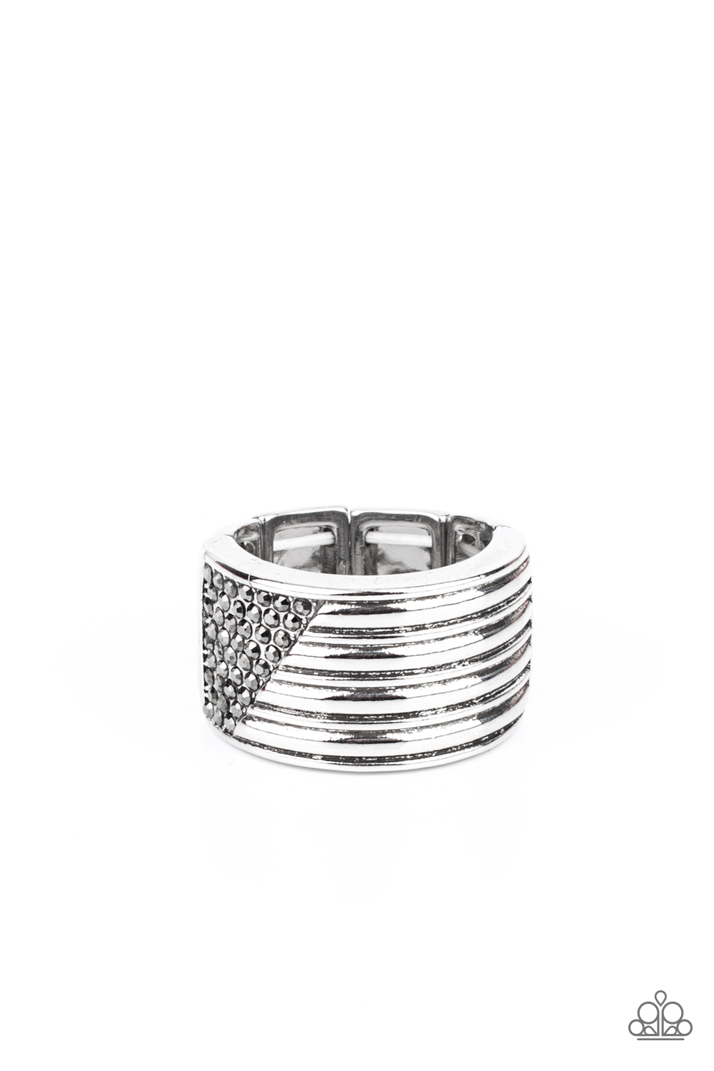 Engraved in linear patterns, the corner of a thick silver band has been chiseled away and encrusted in dainty rows of hematite rhinestones for a standout finish. Features a stretchy band for a flexible fit.