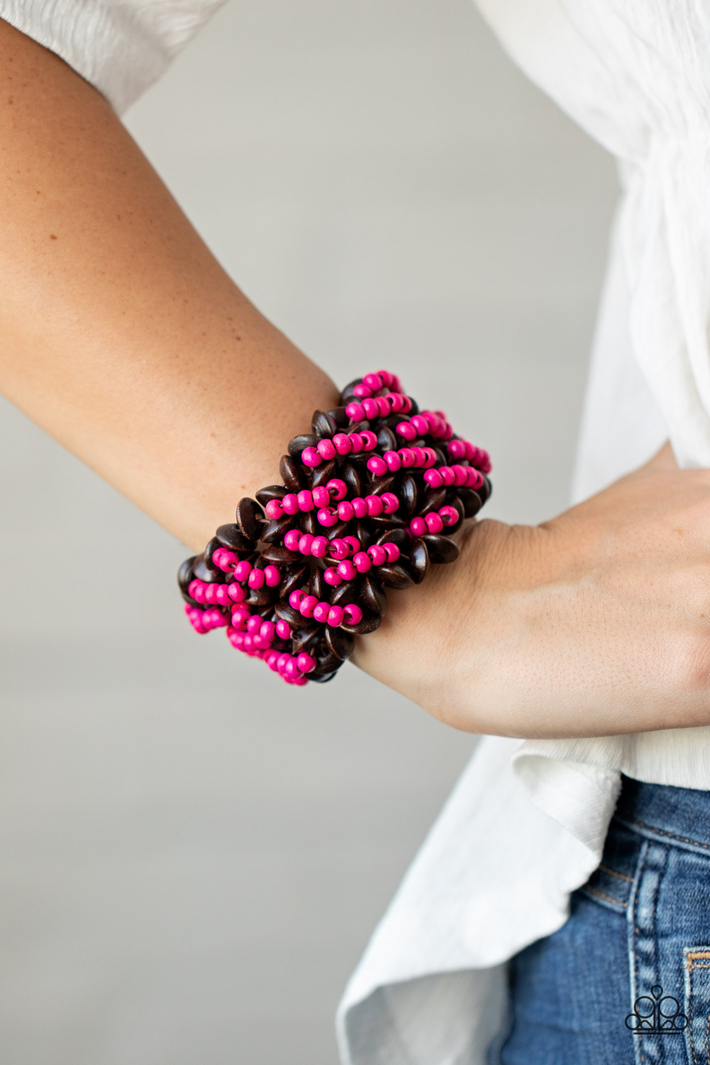A collection of dainty pink wooden beads and brown wooden discs are threaded along knotted stretchy bands, creating a tropical floral pattern around the wrist.