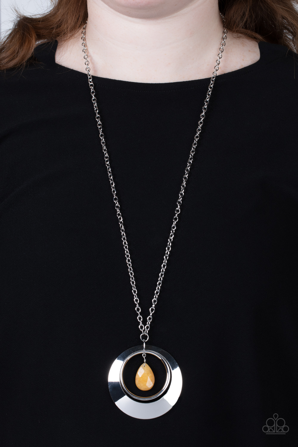 A faceted yellow stone teardrop swings from the top of a bold silver ring and flared silver hoop, creating an enchanting pendant at the bottom of a lengthened silver chain. Features an adjustable clasp closure.