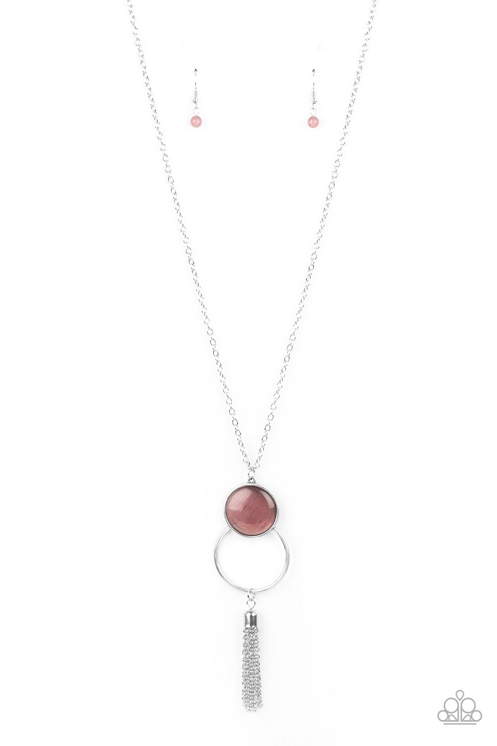 A glowing purple cat's eye stone encased in a simple round silver frame sits atop an airy silver hoop. A silver chain tassel sways from the bottom for a whimsically gleaming pendant at the end of a lengthened silver chain. Features an adjustable clasp closure.