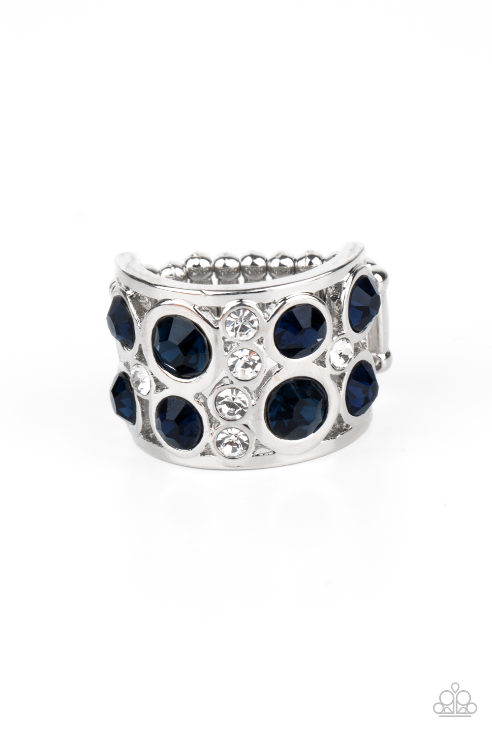 Sporadic sections of dainty white rhinestones and oversized blue rhinestones haphazardly coalesce inside an airy silver frame, creating a dramatically dazzling centerpiece around the finger. Features a stretchy band for a flexible fit.