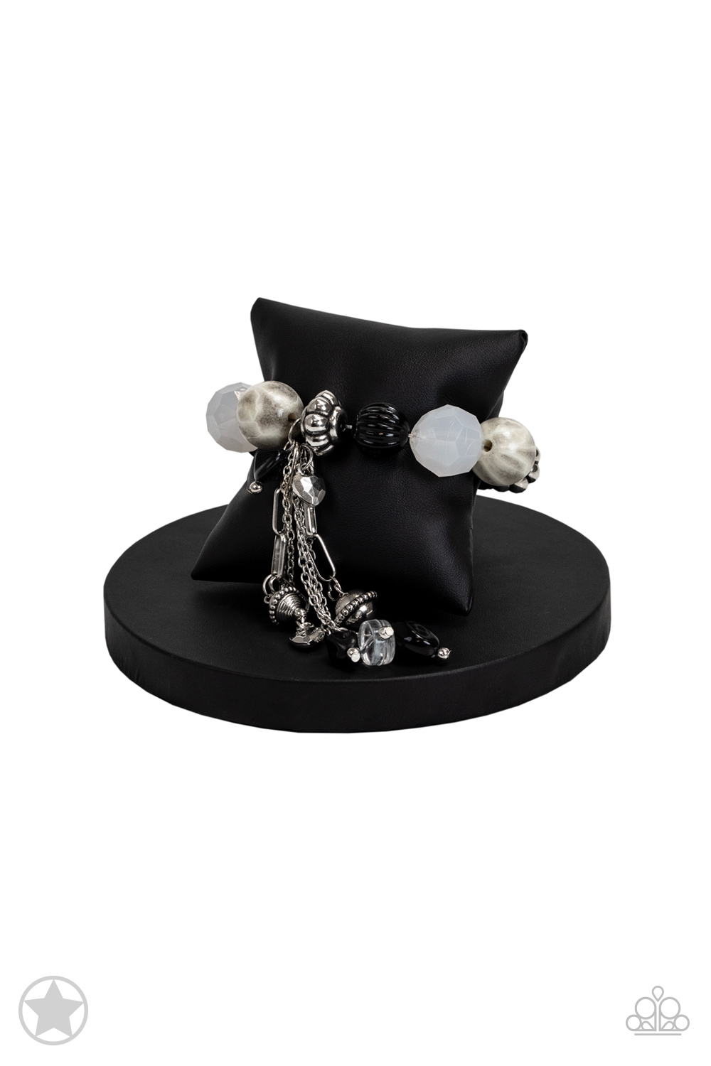 Dainty black beads nestled among beautiful silver and white pieces along a stretchy band. Dangling charms add a dramatic effect.