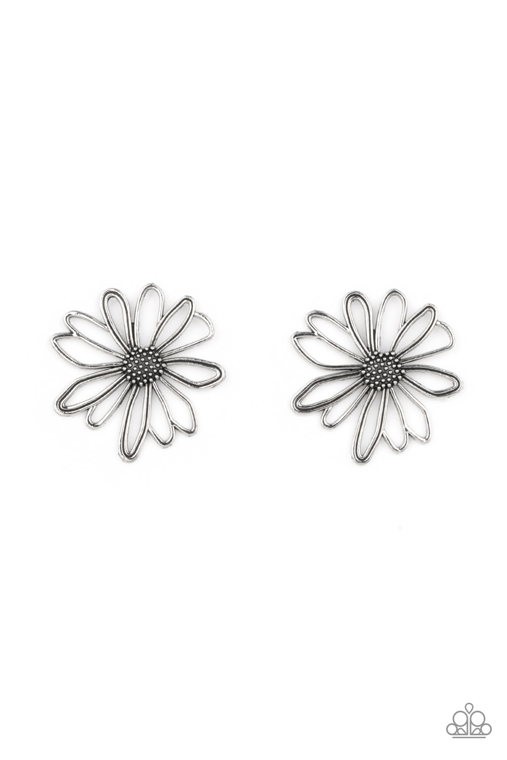 Airy silver petals bloom from a studded silver center, creating a rustic flower. Earring attaches to a standard post fitting.