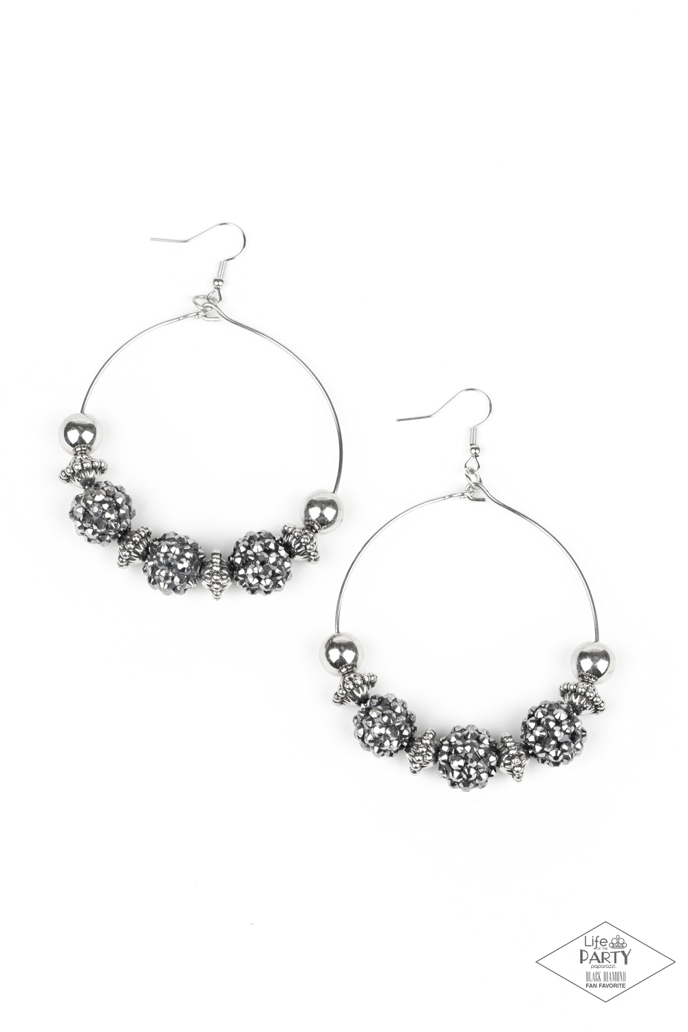 A stunning array of studded silver accents, oversized silver beads, and hematite rhinestone encrusted black beads are threaded along a dainty silver wire hoop, resulting in a dazzling pop of color. Earring attaches to a standard fishhook fitting.