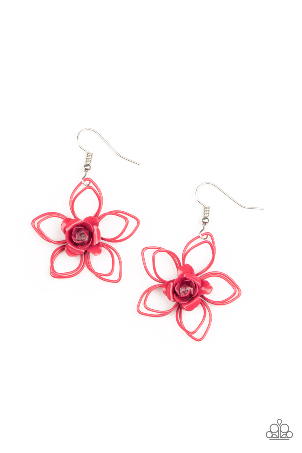 A dainty Fuchsia Fedora rosebud blooms from the center of a layered Fuchsia Fedora wire flower, creating a colorful floral frame. Earring attaches to a standard fishhook fitting.