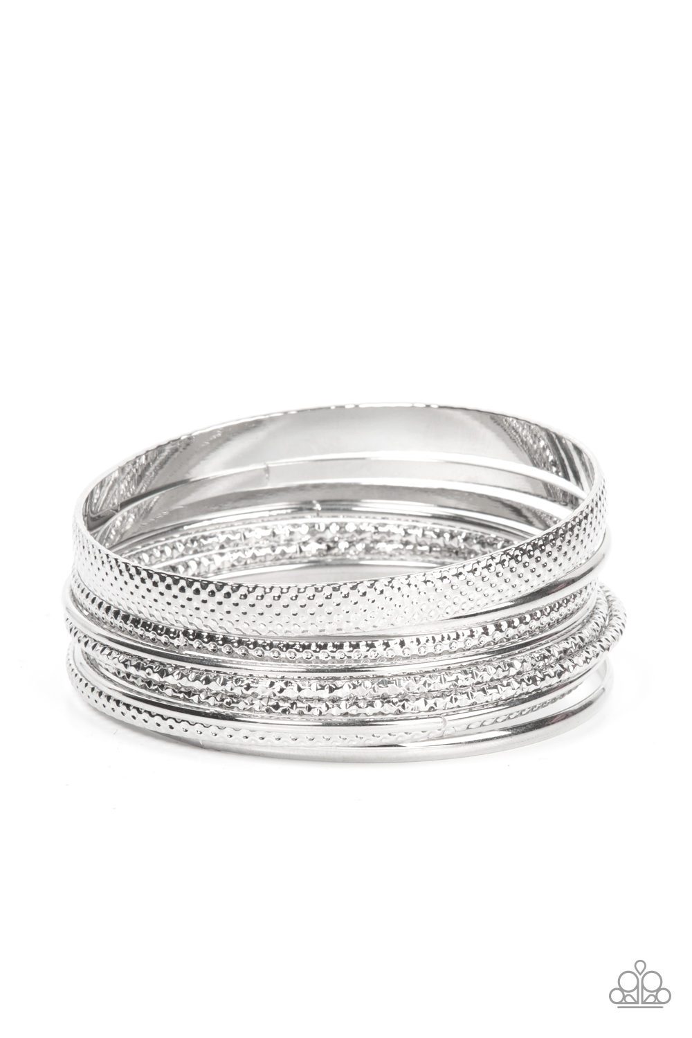 A collection of smooth and textured bangles gives off a sassy chiming melody and makes a dramatic impact as the bright, shimmering silver surfaces stack up the wrist.