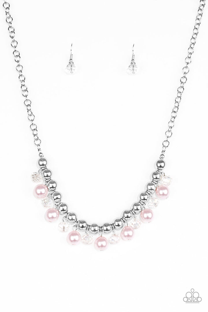 Infused with a bold silver chain, classic silver beads are threaded along a skinny wire below the collar. Pearly pink and faceted crystal-like beads swing from the bottom of the silver beads, creating a refined fringe. Features an adjustable clasp closure. Sold as one individual necklace. Includes one pair of matching earrings.