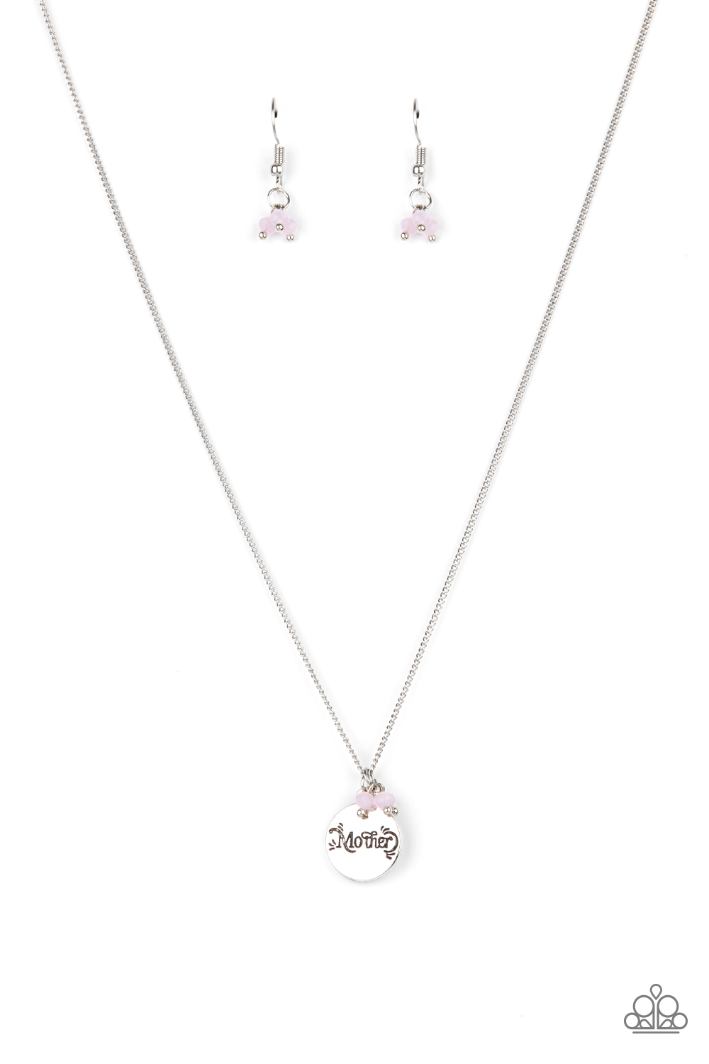 A dainty cluster of opaque pink beads delicately joins a shiny silver disc stamped in the word, "Mother," along a classic silver chain, creating a whimsical pendant below the collar. Features an adjustable clasp closure.