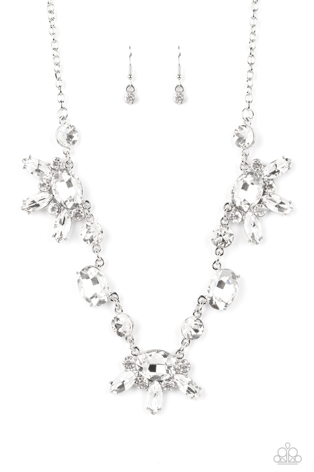 Brilliant white rhinestones in round, oval, and marquise cuts, create an abstract pattern as they fall along the neckline. The faceted surfaces of each gem catch and reflect light from every angle, resulting in a timelss, twinkling statement piece. Features an adjustable clasp closure.